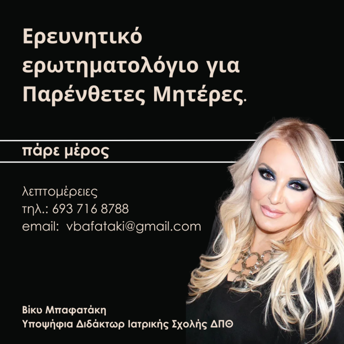 Θα σας παρακαλούσα, εάν έχετε έρθει σε επαφή με παρένθετες μητέρες ή είστε / ήσασταν παρένθετη μητέρα να βοηθήσετε να συμπληρωθεί το βασικό ερωτηματολόγιο. Επιπρόσθετα από το ΕΚΠΑ δόθηκε και ένα ψυχομετρικό (2 σελίδων) ώστε να διαμορφωθεί το προφίλ των παρένθετων μητέρων στην Ελλάδα.